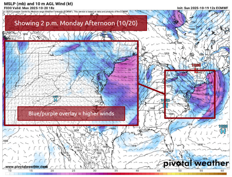 A high-pressure system builds up around our area to our south today and sets up a relatively notable pressure gradient between the lower pressures to our north. This setup will be the main culprit behind the windier conditions and gusts on Monday.
