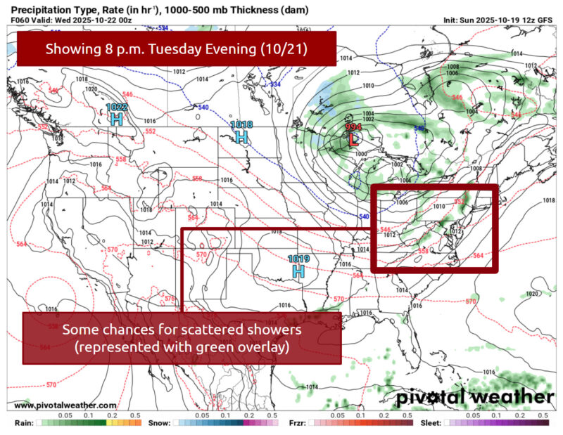 Another low-pressure system is currently brewing in the central USA/central-southern Canada area. This system will travel eastward and bring another cold front over our area on Tuesday afternoon and evening. With the passage of this front alongside some lingering moisture, there is a small chance of scattered showers in the nighttime, but it should not pose a substantial issue.