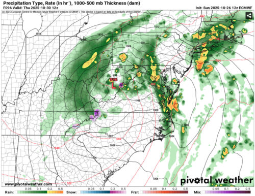 Throughout Monday and Tuesday, a shortwave trough with an offshore low-pressure system will bring widespread moisture to much of the Southeast US. Luckily, this small disturbance is expected to stay to our south, keeping College Park dry for the first half of the week. During this time, moderate cloud cover is anticipated to move into the area and should play a small role in limiting radiative cooling overnight and regulating midday heating Tuesday and Wednesday. However, all of this will change on Thursday, as a much larger trough will sweep through the country and eventually make its way into our area (pictured below).