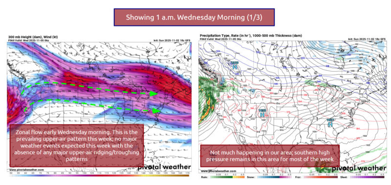 An upper air trough rolls off the coast on Monday, which accounts for the cloudy conditions that we’ll see today. Otherwise, once that’s out of the way, high pressure will build to our south, and the upper air pattern shifts to being primarily zonal (meaning, straight east-to-west flow without any major dips in the jet stream, in our case) until the end of the week, which will generally point to no major weather events for the workweek.