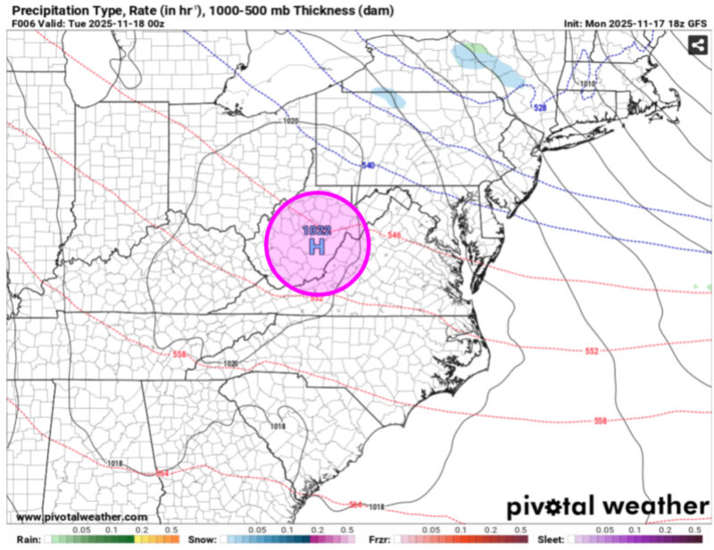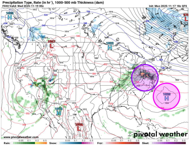 Pictured is the high-pressure system (pink circle) that was in our area yesterday evening. The red and blue dotted lines are indicative of atmospheric thickness lines, which can be used to represent temperatures. When plotted with isobars, which are lines of constant pressure (black solid lines), the alignment of thickness lines relative to the isobars can represent temperature advection (the process of warm/cool air moving into/out of the area). In this case, isobars are plotted relatively perpendicular to the thickness lines, which indicates the presence of wind that moves thickness/temperatures. Red dotted lines depict warm air advection, or warm air moving into a region of cooler air. Blue dotted lines depict cold air advection, or cold air moving into a region of warmer air. In this weather map, we are seeing the transition from cold air advection to warm air advection.