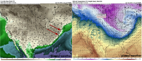 Thankfully, this system quickly exits our area by Wednesday morning, as it is pushed out to sea by a much larger and stronger trough that is set to impact a large portion of the eastern US during the second half of this week. This trough, opposite of the weak shortwave previously discussed, is an extension of the polar jet stream and will help pull much colder and drier air southward into College Park. This is modeled below, where the image on the left displays dry air forcing Tuesday’s moisture offshore, while the image on the right shows the influx of cold Canadian air pushing into the DMV by Thursday morning.