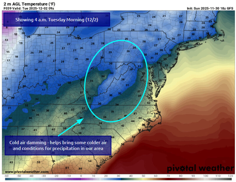 The main event of the week will be the wintry mix/rain that our area will see this Tuesday. A strong, low-pressure system alongside a big band of moisture from the southwest will provide the conditions necessary for the rain we’ll see on Tuesday.
