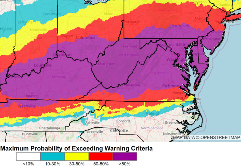 Our local National Weather Service office has already issued its highest risk of life-threatening winter weather conditions for this weekend. This is corroborated by the Experimental Winter Storm Outlook (WSO), which places the entire DMV in the highest probability of exceeding winter-storm warning criteria on its Day 4 Outlook, as seen below.