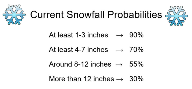 It is extremely important to note that forecasts will continue to change over the next few days as more details emerge closer to the event. With the snow-ice line currently placed just south of DC, a further northward shift would lead to a prolonged period of wintry mix on Sunday that could significantly cut down on overall snow totals. Still, this scenario would be just as impactful, as less snow would likely lead to greater ice accumulations. At this point, anything from an icy-wintry mess to a historic snowfall event upwards of 15 inches remains possible.