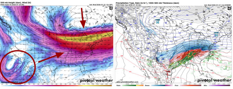 So, why is this happening? It all starts with a wave of energy off the coast of Baja California and an extremely large and powerful trough pulling frigid Canadian air into much of the US. This setup is pictured below, where the wave of energy will move northeastward, clash with the incoming cold air, and spark widespread precipitation everywhere from Texas to the Northeast.