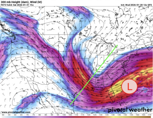 The green line represents the positively tilted trough axis, while the red circle represents the developing coastal low pressure system.