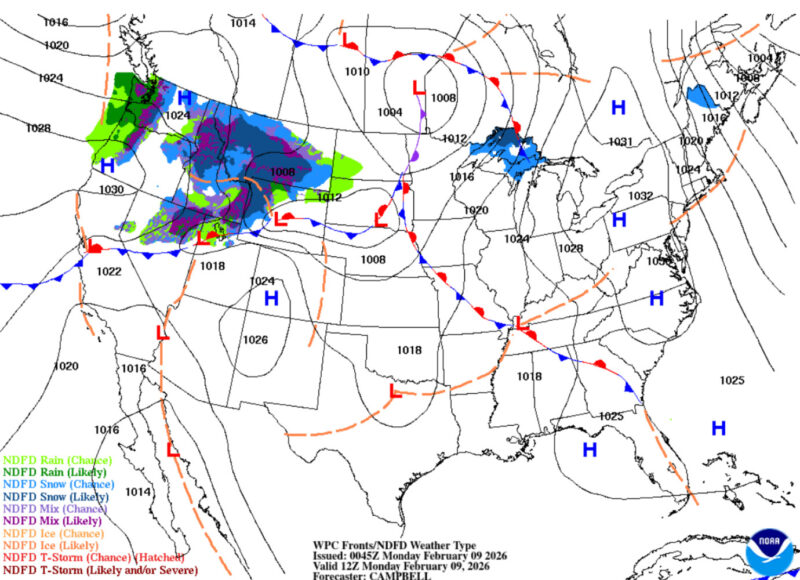 A 24-hour short-range WPC map of the fronts moving across the country. Picture courtesy of NOAA and the National Weather Service. (Image via https://www.wpc.ncep.noaa.gov/basicwx/94fndfd.gif)