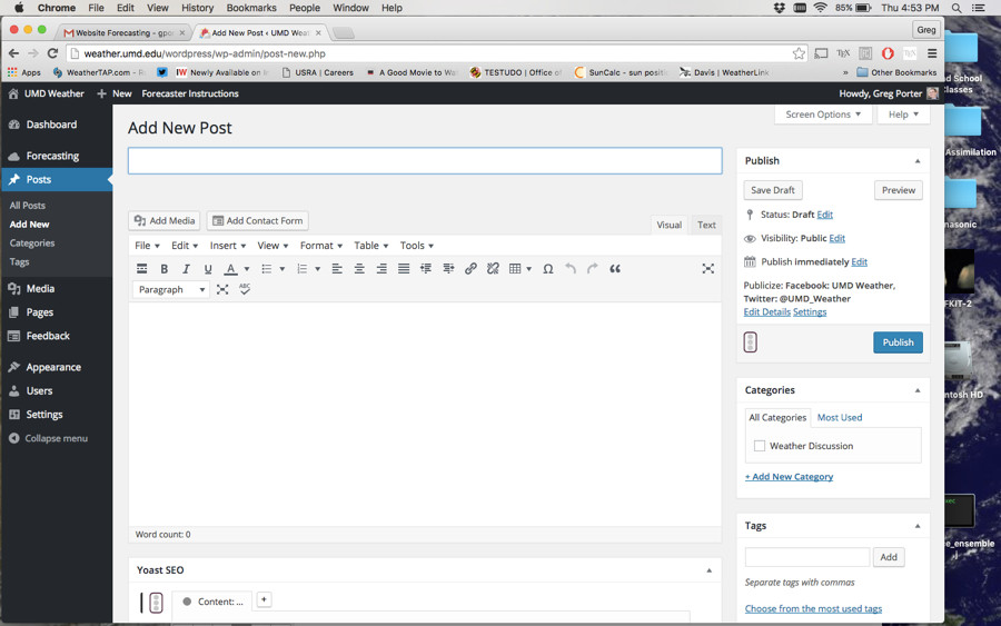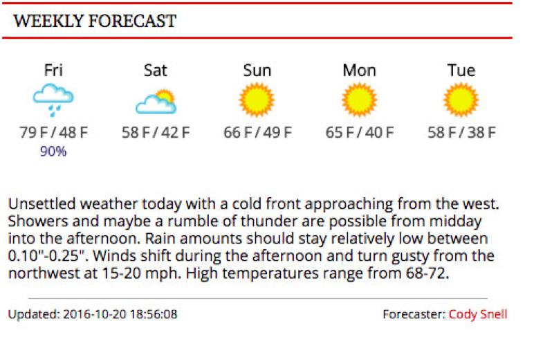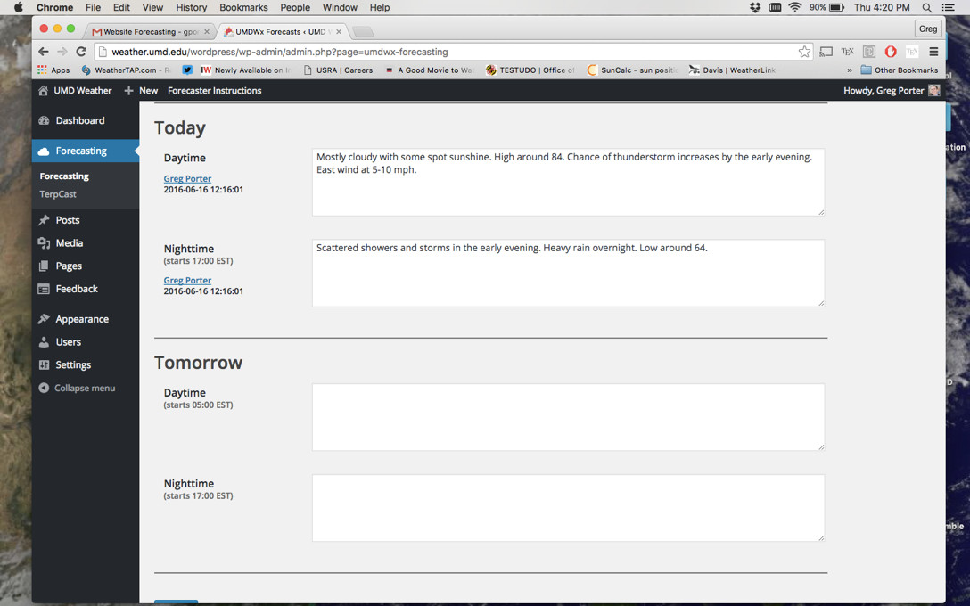 Daily forecast snippets (One in the evening. One for the “NEXT” morning): Morning updates are automatically published at 5am, afternoon updates published at 5pm. Please include temperatures, sky cover, precipitation etc. Limit to 300 characters. Forecasts are entered here (CLICK LINK!!!).