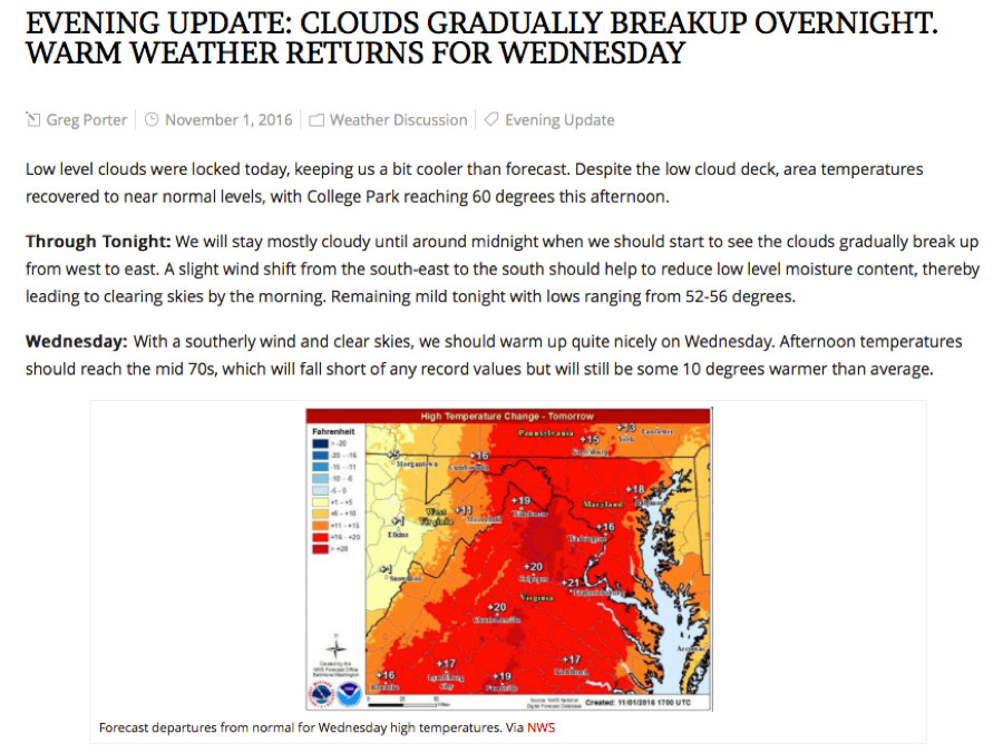 -Make sure you include at least one photo in your blog. Credit the source. (i.e. Image displays temperatures for the DC/College Park region at 4 pm via UMD TROWAL)